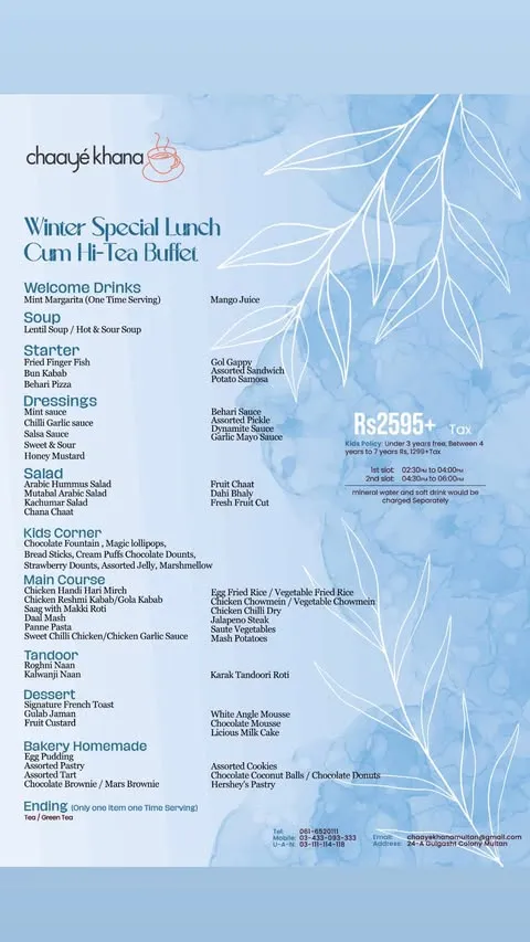 Chaaye Khana is a well-known café-style restaurant located in Gulgasht Colony, Multan. Famous for its extensive breakfast options, Pakistani specials, continental dishes, BBQ platters, bakery items, desserts, and a wide variety of teas and beverages, Chaaye Khana offers a complete dine-in experience for families and friends. From early morning breakfast to late-night dinners, the restaurant serves traditional desi flavors alongside modern café favorites in a comfortable and welcoming environment.