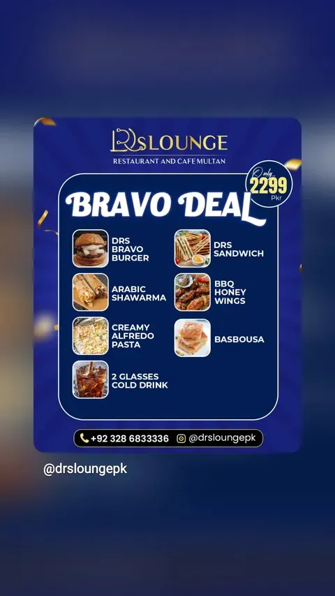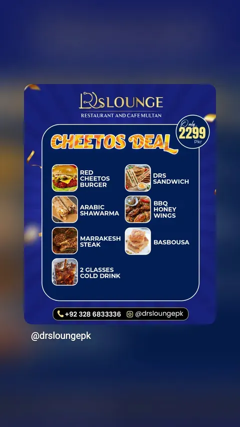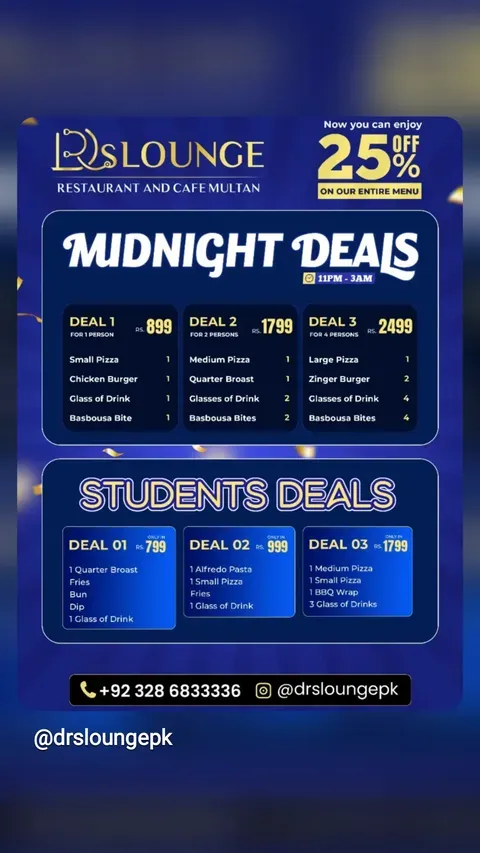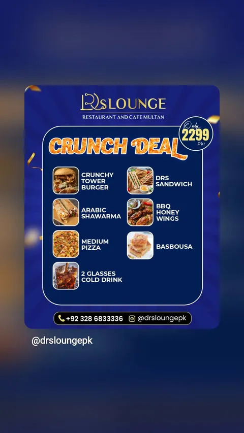 Doctor Lounge Restaurant is a modern café-style dining destination located in C Block, Gulgasht Colony, Multan. Known for its breakfast platters, injected broast, premium pizzas, burgers, pasta, grilled chicken dishes, desserts, and specialty beverages, the restaurant offers a wide variety of options in a comfortable dine-in environment.