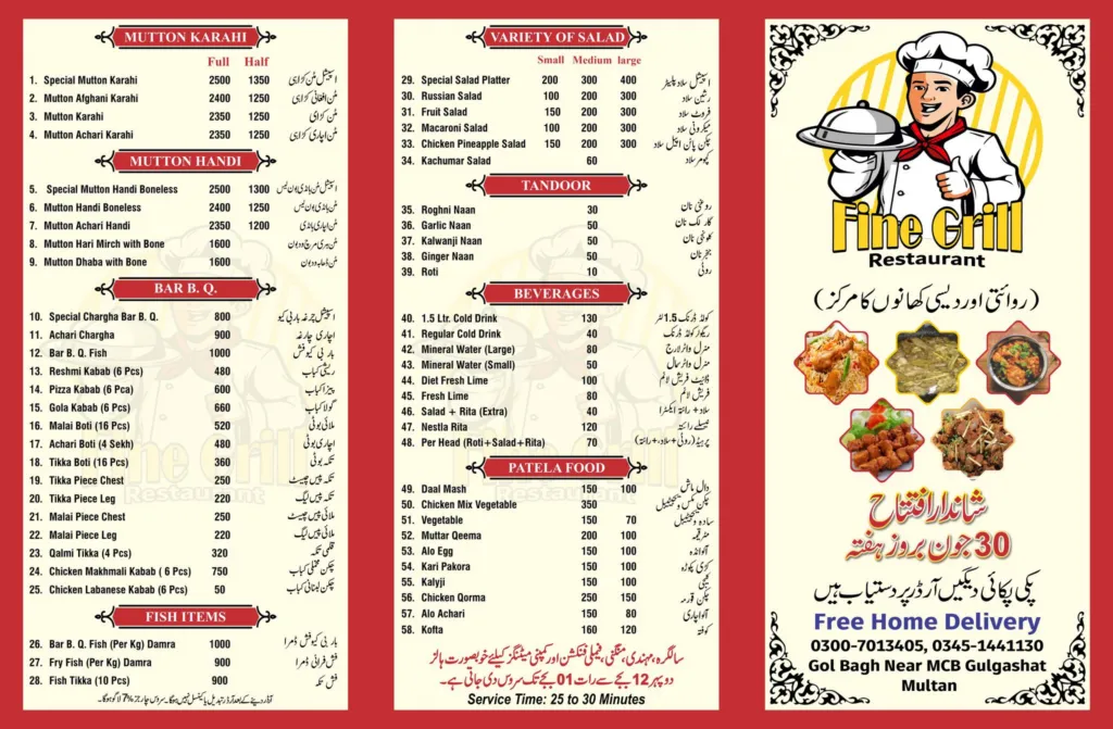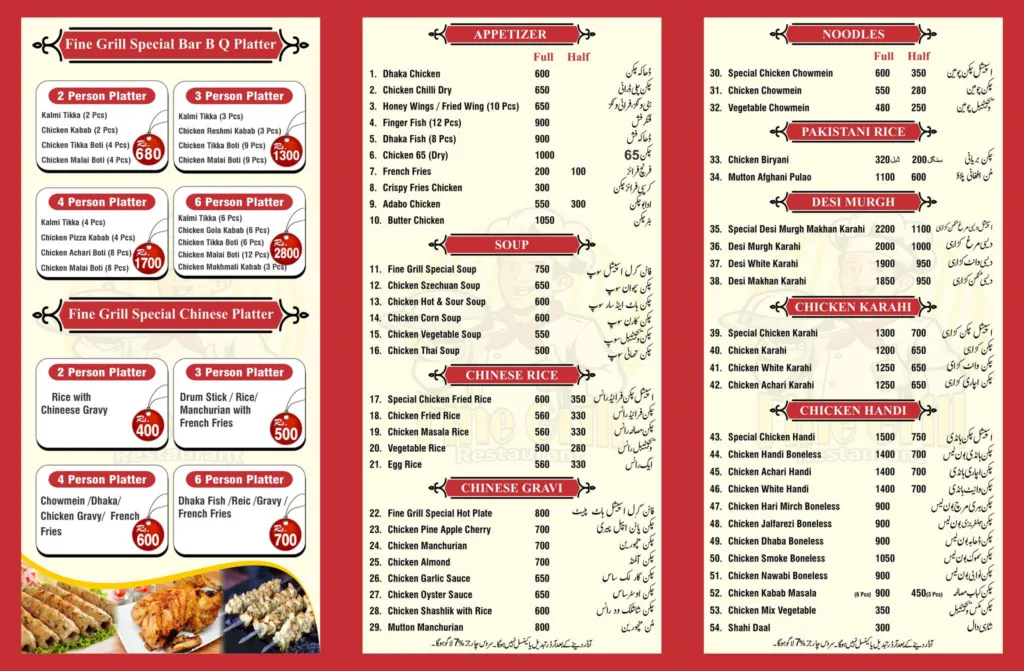 Fine Grill Restaurant in Multan offers a highly diverse and extensive menu that covers traditional Pakistani cuisine, BBQ specialties, Chinese dishes, seafood, patela food, and family platters. With late-night service till 3 am, it is suitable for family dinners, group gatherings, and BBQ lovers. The wide range of karahi, handi, mutton specialties, desi murgh, and special platters makes it a complete dining destination for anyone looking for variety and full-course meals in North Gulgasht Colony, Multan.