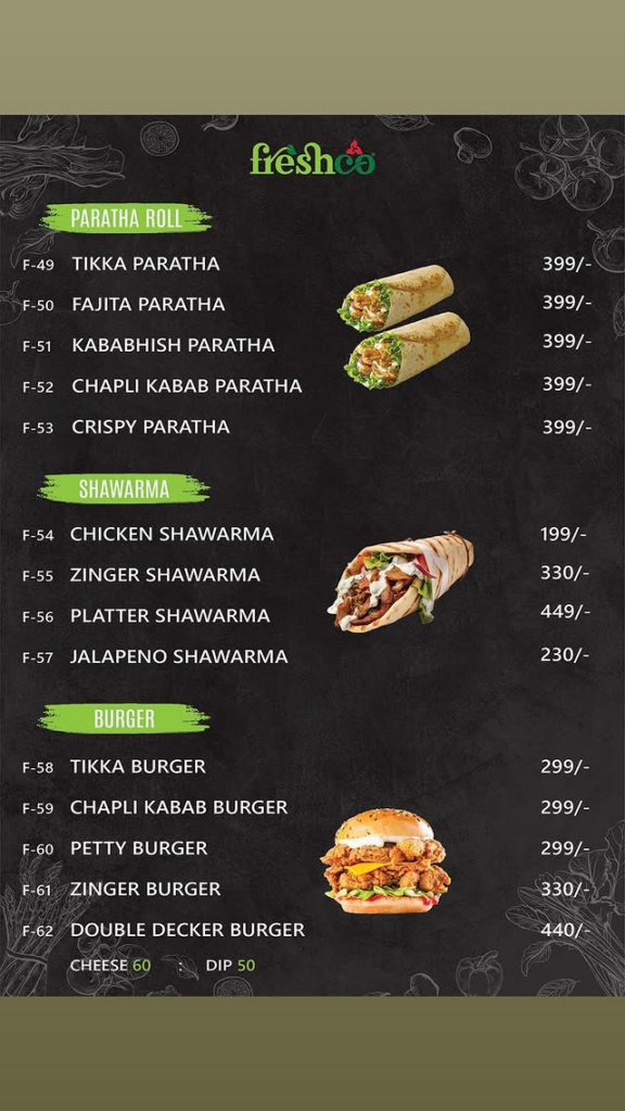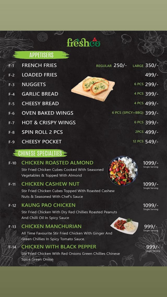 🥡 Chinese Specialties & Rice Item Name (Single Serving) Price (PKR) Chicken Roasted Almond 1,099/- Chicken Cashew Nut 1,099/- Kaung Pao Chicken 1,099/- Chicken Manchurian 999/- Chicken with Black Pepper 999/- Chicken Chilli Dry 1,099/- Freshco Special Chowmein 1,249/- Chicken Chowmein 949/- Vegetable Chowmein 849/- Freshco Special Rice 999/- Egg Fried Rice 799/- Chicken Fried Rice 849/- Vegetable Rice 749/- Chicken Masala Rice 849/- Steam Rice 699/-