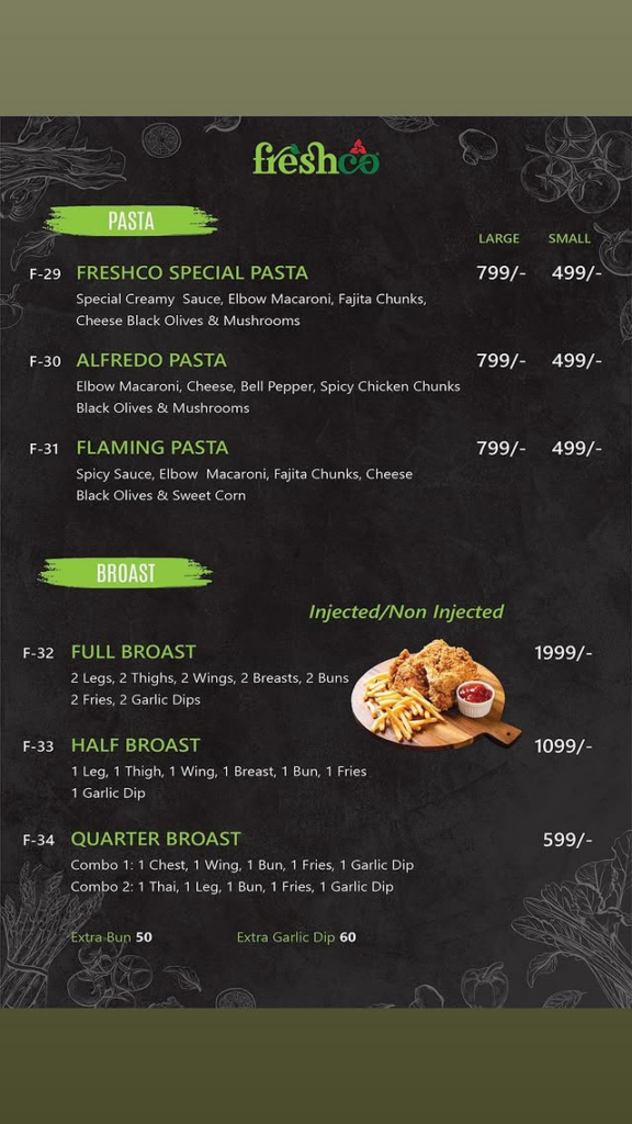 🍝 Pasta & Broast Item Name Small Price Large Price Freshco Special Pasta 499/- 799/- Alfredo Pasta 499/- 799/- Flaming Pasta 499/- 799/- Broast Items Description Price Full Broast 8 Pieces (2 Leg, 2 Thigh, 2 Wing, 2 Breast) + Sides 1,999/- Half Broast 4 Pieces (1 Leg, 1 Thigh, 1 Wing, 1 Breast) + Sides 1,099/- Quarter Broast 2 Pieces (Chest/Wing OR Thai/Leg) + Sides 599/-