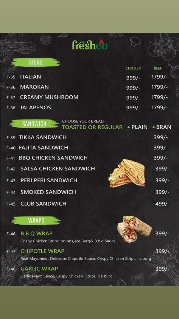 🥪 Steaks, Sandwiches & Wraps Item Name Chicken Price Beef Price Italian Steak 999/- 1,799/- Moroccan Steak 999/- 1,799/- Creamy Mushroom Steak 999/- 1,799/- Jalapenos Steak 999/- 1,799/- Sandwiches (Any Bread) Tikka / Fajita / BBQ / Salsa / Peri Peri / Smoked 399/- Club Sandwich All-time favorite classic 499/- Wraps B.B.Q / Chipotle / Garlic 399/-