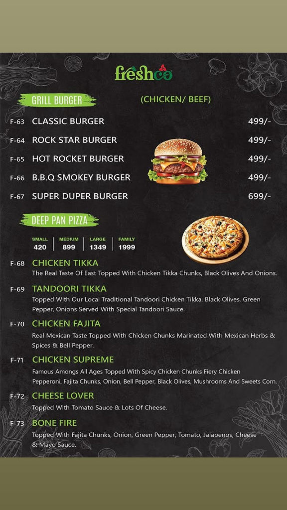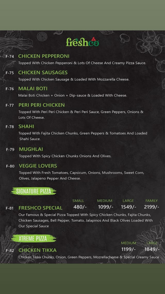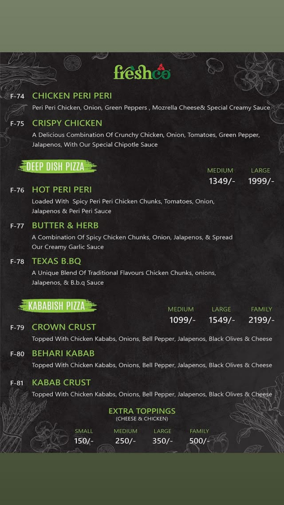 Specialty Pizzas Item Name Medium Large Family Freshco Special Pizza 1,099/- 1,549/- 2,199/- Xtreme Pizza (Tikka/Peri/Crispy) 1,199/- 1,849/- – Deep Dish (Hot Peri/Butter Herb/Texas BBQ) 1,349/- 1,999/- – Crown Crust / Behari Kabab / Kabab Crust 1,099/- 1,549/- 2,199/-