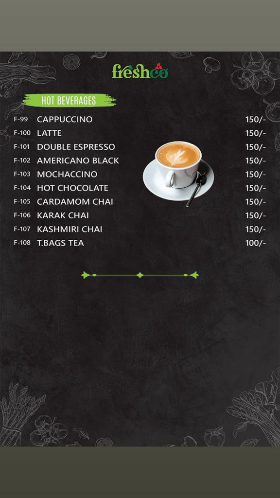 Item Name Price (PKR) Cappuccino 150/- Latte 150/- Double Espresso 150/- Americano Black 150/- Mochaccino 150/- Hot Chocolate 150/- Cardamom Chai 150/- Karak Chai 150/- Kashmiri Chai 150/- T.Bags Tea 100/-