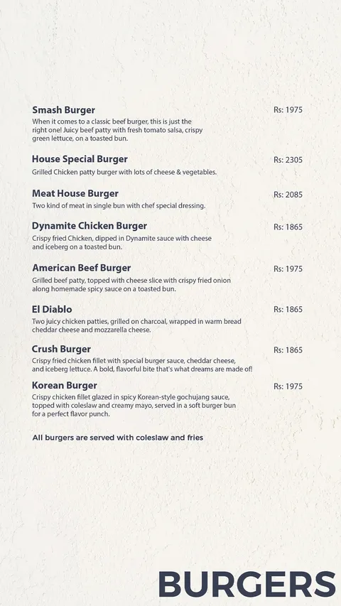 🍔 Burgers (Served with Fries & Coleslaw)