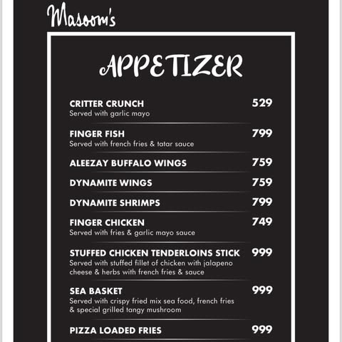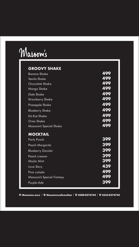 🥤 Smoothies, Shakes & Mocktails Item Price (PKR) Smoothies (Banana, Strawberry, Blueberry) 479 Masoom’s Special Smoothie 499 Milkshakes (Oreo, KitKat, Chocolate, Mango etc.) 499 Mocktails (Party Punch, Peach Margarita, Blueberry Dazzler) 399 Pina Colada / Special Fantasy 499