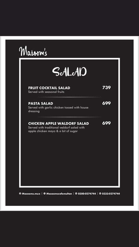 🥗 Salads Salad Price (PKR) Fruit Cocktail Salad 739 Pasta Salad 699 Chicken Apple Waldorf Salad 699
