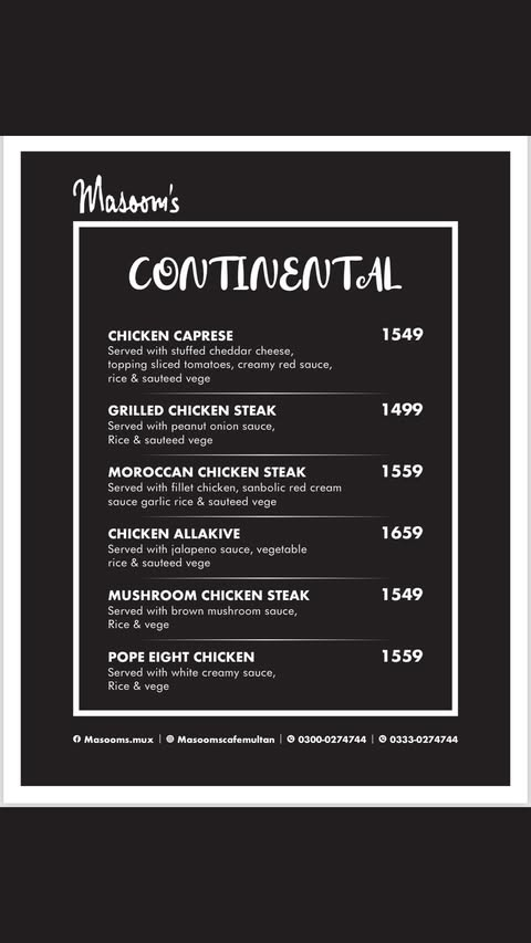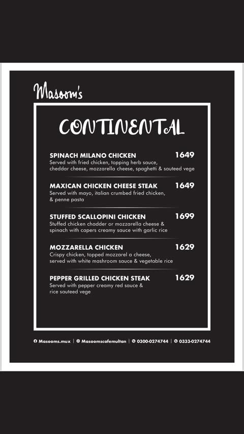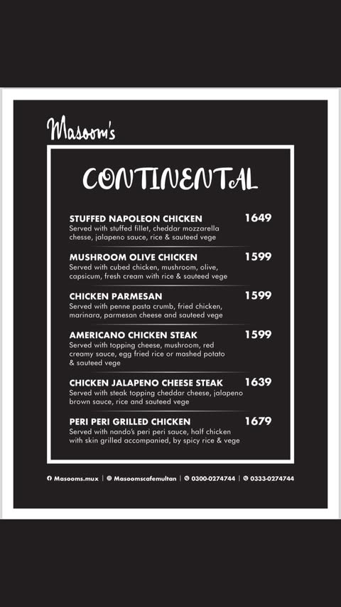 🍽️ Continental Chicken Dishes Dish Price (PKR) Chicken Lasagna 1,339 Tarragon Chicken Steak 1,499 Hani Pani Chicken 1,549 Moroccan Chicken 1,549 Mushroom Chicken 1,549 Crumb Fried Chicken 1,549 Hannan Spicy Chicken 1,549 Chicken Caprese 1,549 Grilled Chicken Steak 1,499 Moroccan Chicken Steak 1,559 Chicken Allakive 1,659 Mushroom Chicken Steak 1,549 Pope Eight Chicken 1,559 Green Caper Chicken Steak 1,549 Chicken Pepper Steak 1,559 Crispy Chicken 1,599 Ala Chef’s Steak 1,549 Western Chicken 1,579 Honey Mustard Chicken 1,599 Stuffed Napoleon Chicken 1,649 Mushroom Olive Chicken 1,599 Chicken Parmesan 1,599 Americano Chicken Steak 1,599 Chicken Jalapeno Cheese Steak 1,639 Peri Peri Grilled Chicken 1,679