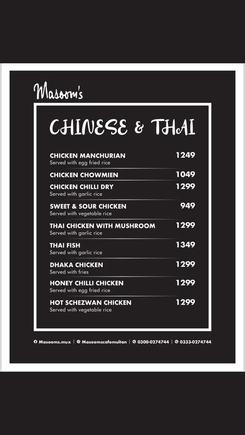 ⭐ Final Verdict Masoom’s Café Multan offers one of the biggest menus in the city , combining continental, Chinese, Thai, pizza, burgers, seafood, desserts, and premium beverages under one roof. With late-night service till 2 AM , indoor & outdoor seating , and two prime locations , it is a perfect café for family dinners, casual meetups, and celebrations.