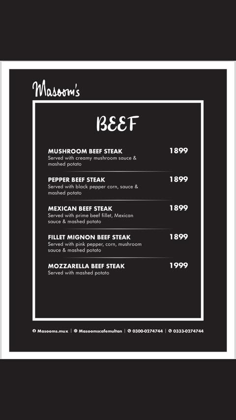 🥩 Beef Steaks Beef Dish Price (PKR) Mushroom Beef Steak 1,899 Pepper Beef Steak 1,899 Mexican Beef Steak 1,899 Fillet Mignon Beef Steak 1,899 Mozzarella Beef Steak 1,999