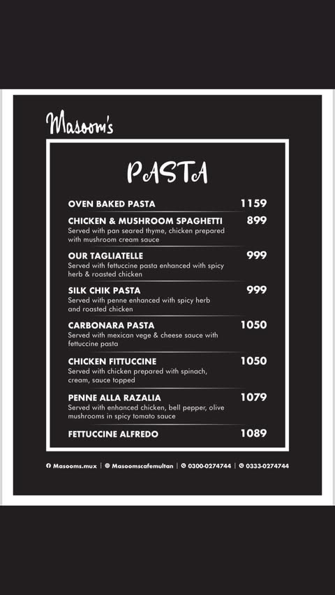 🍝 Pasta Pasta Price (PKR) Oven Baked Pasta 1,159 Chicken & Mushroom Spaghetti 899 Our Tagliatelle 999 Silk Chick Pasta 999 Carbonara Pasta 1,050 Chicken Fettuccine 1,050 Penne Alla Razalia 1,079 Fettuccine Alfredo 1,089