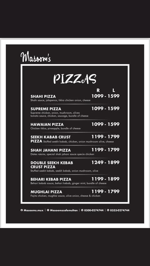 🍕 Pizzas (Regular / Large) Pizza Price (PKR) Veggie Lover Pizza 1,049 – 1,449 Cheese Gold Pizza 1,049 – 1,449 Chicken Tikka Pizza 1,069 – 1,549 Chicken Fajita Pizza 1,069 – 1,549 Achari Pizza 1,099 – 1,599 Bonfire Pizza 1,099 – 1,599 Masoom’s Special Pizza 1,099 – 1,599 Shahi Pizza 1,099 – 1,599 Supreme Pizza 1,099 – 1,599 Hawaiian Pizza 1,099 – 1,599 Seekh Kabab Crust Pizza 1,199 – 1,799 Shah Jahani Pizza 1,199 – 1,799 Double Seekh Kabab Crust Pizza 1,249 – 1,899 Behari Kabab Pizza 1,199 – 1,899 Mughlai Pizza 1,199 – 1,799