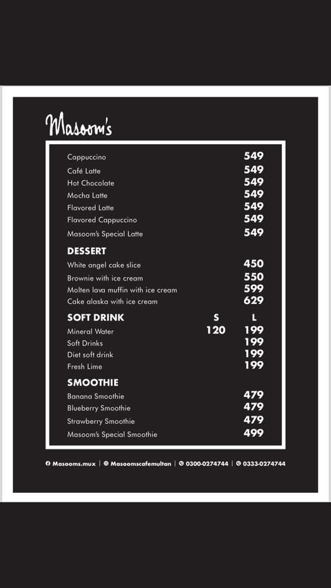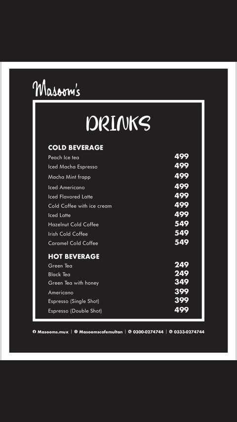 Hot Beverages Item Price (PKR) Green Tea / Black Tea 249 Americano / Espresso 399 Cappuccino / Latte / Mocha 549 Masoom’s Special Latte 549