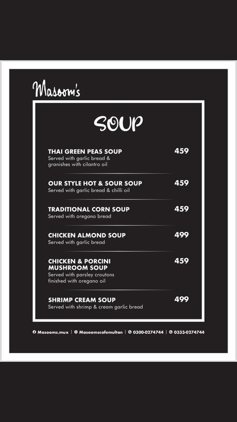 🍲 Soups Soup Price (PKR) Thai Green Peas Soup 459 Our Style Hot & Sour Soup 459 Traditional Corn Soup 459 Chicken Almond Soup 499 Chicken & Porcini Mushroom Soup 459 Shrimp Cream Soup 499
