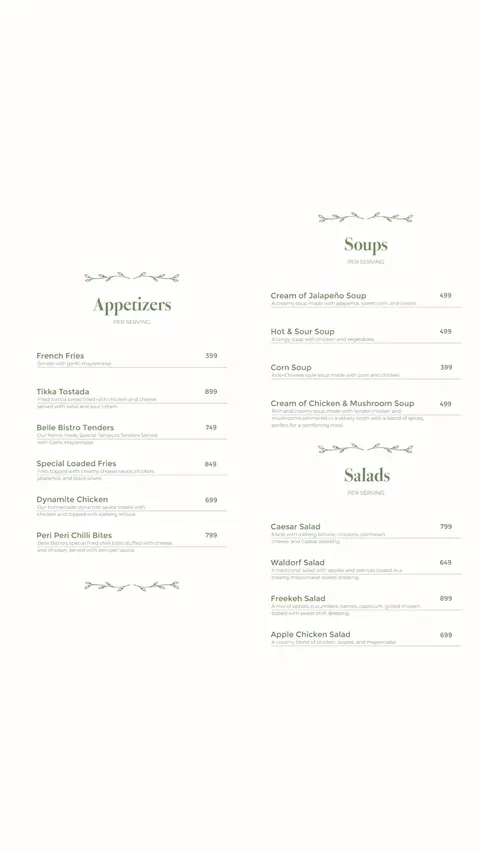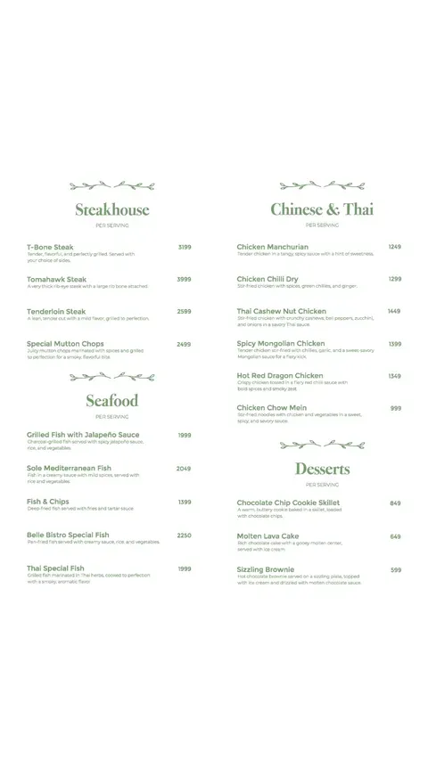 Belle Bistro Restaurant offers a complete modern dining experience in Multan with an extensive menu covering steaks, Chinese & Thai dishes, seafood, pizza, burgers, pasta, desserts, shakes, smoothies, frappes, and premium beverages. Their steakhouse selection, signature fish dishes, and specialty drinks make it an ideal place for both casual dining and special occasions. With late-night hours and a prime location in Wapda Town, Belle Bistro stands out as one of Multan’s top contemporary restaurants for quality food and a comfortable dine-in atmosphere.