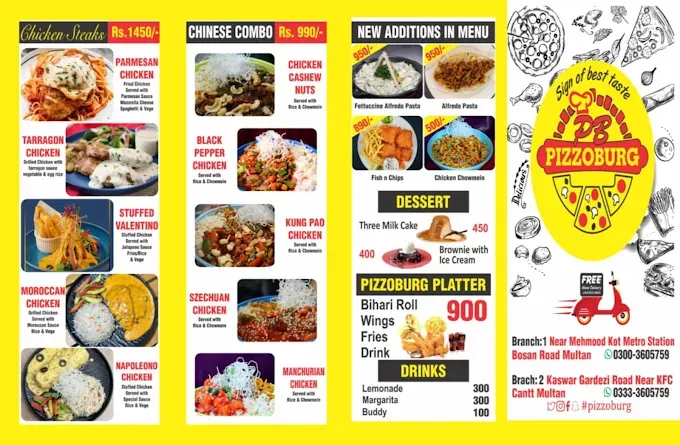 Pizzoburg Multan is a popular fast-food restaurant known for its affordable pizzas, burgers, Chinese combos, pasta, and late-night service. Located in Cantt area near KFC, Pizzoburg is a favorite spot for students, families, and night food lovers. From creamy pizzas to crispy burgers and Chinese meals, Pizzoburg offers a wide menu with budget-friendly prices.