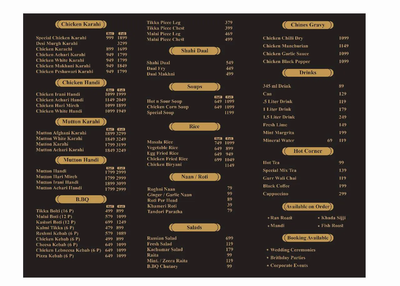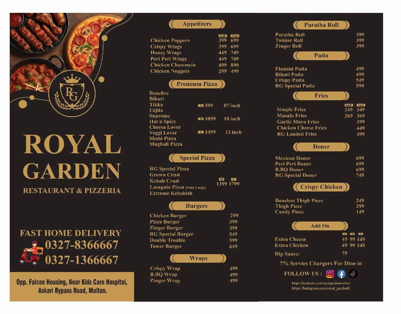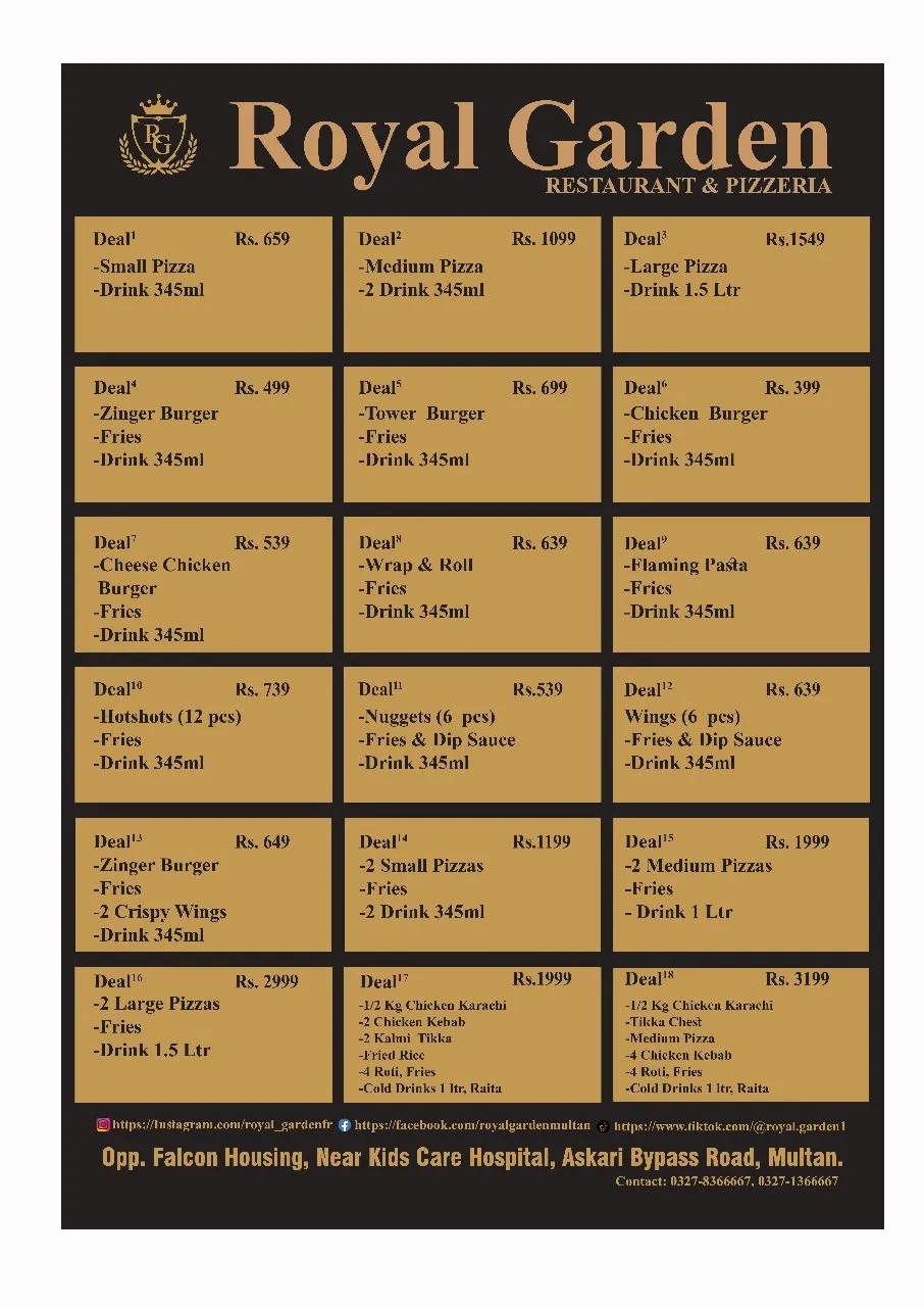 Royal Garden Restaurant is a well-known dining place that offers a comfortable and family-friendly environment along with a wide variety of delicious food options. The restaurant is popular for its mix of traditional Pakistani, BBQ, and continental dishes, all prepared with fresh ingredients and rich flavors. From karahi and handi to grilled BBQ items and rice dishes, the menu is designed to satisfy different taste preferences.