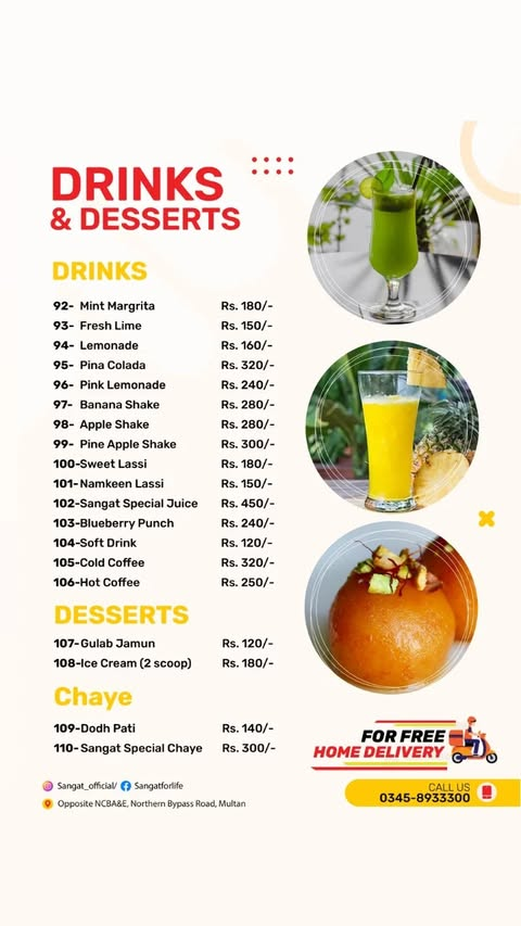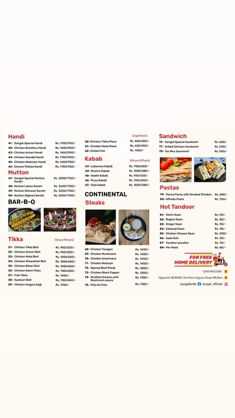 Sangat Restaurant in Multan is a well-known evening dining spot offering a wide variety of Pakistani, Chinese, BBQ, Continental, rice dishes, steaks, sandwiches, platters, and desserts. Located on Northern Bypass Road opposite NCBA&E campus, the restaurant serves families and groups with extensive menu options including karahi, handi, mutton specialties, BBQ tikka, kababs, pasta, and special deals. Below is the complete menu with all items and prices exactly as provided.