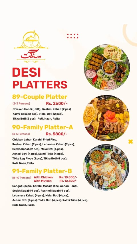 DESI PLATTERS Platter Name Serving Size Items Included Price (Rs.) 89 – Couple Platter 2–3 Persons Chicken Handi (Half), Reshmi Kabab (2 pcs), Kalmi Tikka (2 pcs), Malai Boti (2 pcs), Tikka Boti (2 pcs), Roti, Naan, Raita 2,600 90 – Family Platter A 4–5 Persons Chicken Lahori Karahi, Fried Rice, Reshmi Kabab (2 pcs), Lebanese Kabab (2 pcs), Seekh Kabab (2 pcs), Malai Boti (4 pcs), Achari Boti (4 pcs), Kalmi Tikka (4 pcs), Tikka Leg Piece (1 pc), Tikka Boti (4 pcs), Roti, Naan, Raita 5,800 91 – Family Platter B (Chicken) 8–10 Persons Sangat Special Karahi, Masala Rice, Achari Handi, Seekh Kabab (4 pcs), Reshmi Kabab (4 pcs), Lebanese Kabab (4 pcs), Malai Boti (4 pcs), Achari Boti (4 pcs), Tikka Boti (4 pcs), Kalmi Tikka (4 pcs), Roti, Naan, Raita 10,800 91 – Family Platter B (Mutton) 8–10 Persons Sangat Special Karahi, Masala Rice, Achari Handi, Seekh Kabab (4 pcs), Reshmi Kabab (4 pcs), Lebanese Kabab (4 pcs), Malai Boti (4 pcs), Achari Boti (4 pcs), Tikka Boti (4 pcs), Kalmi Tikka (4 pcs), Roti, Naan, Raita 12,800