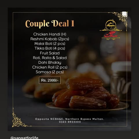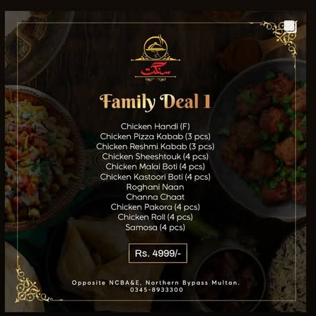 Deals Deal Name Items Included Price (Rs.) Couple Deal 1 Chicken Handi (H), Reshmi Kabab (2 pcs), Malai Boti (2 pcs), Tikka Boti (4 pcs), Fruit Salad, Roti, Raita & Salad, Dahi Bhalay, Chicken Roll (2 pcs), Samosa (2 pcs) 2,999 Couple Deal 2 Chicken Handi (H), Reshmi Kabab (2 pcs), Malai Boti (2 pcs), Tikka Boti (4 pcs), Fruit Salad, Roti, Raita & Salad, Channa Chaat, Vegetable Roll (2 pcs), Chicken Adabo (2 pcs) 2,950 Family Deal 1 Chicken Handi (F), Chicken Pizza, Kabab (3 pcs), Chicken Reshmi Kabab (3 pcs), Chicken Sheeshtouk (4 pcs), Chicken Malai Boti (4 pcs), Chicken Kastoori Boti (4 pcs), Roghani Naan, Channa Chaat, Chicken Pakora (4 pcs), Chicken Roll (4 pcs), Samosa (4 pcs) 4,999 Family Deal 2 Mutton White Karahi (H), Chicken Achari Handi (H), Chicken Afghani Pulao (H), Kalmi Tikka (3 pcs), Reshmi Kabab (3 pcs), Mix Salad Platter, Roghani Naan, Raita, Dahi Bhalay, Vegetable Pakora (6 pcs), Vegetable Roll (6 pcs), Samosa (6 pcs) 5,199