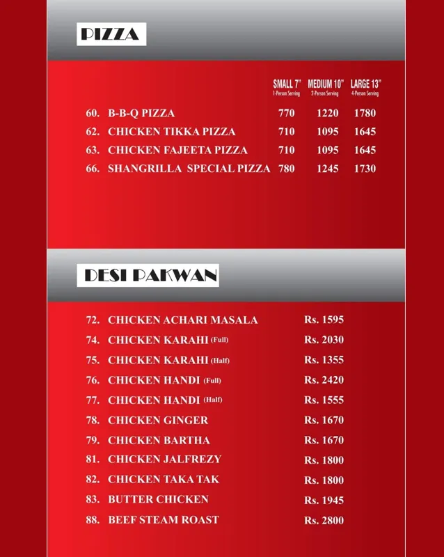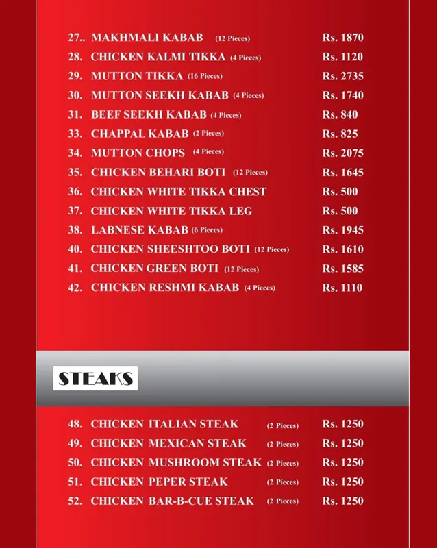 Shangrilla Gardens & BBQ is a popular restaurant in Multan, well-known for its BBQ dishes, traditional Pakistani curries, soups, pizzas, and rice items. With its large outdoor seating and family-friendly environment, it is a favorite spot for gatherings, casual dinners, and BBQ lovers. The restaurant offers a wide variety of dishes to suit different tastes.