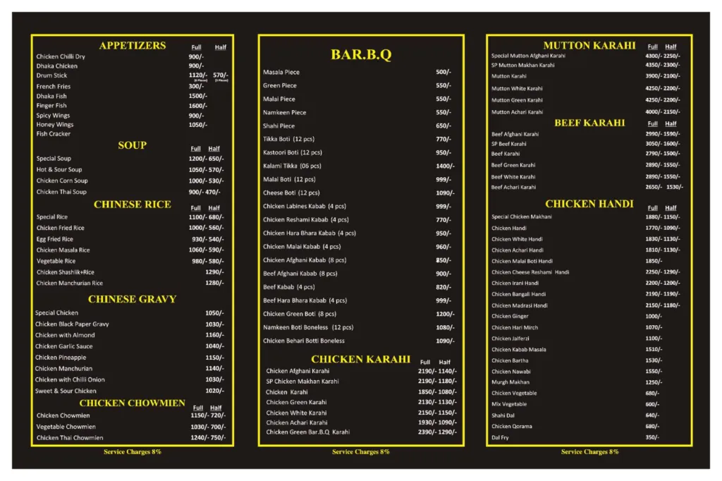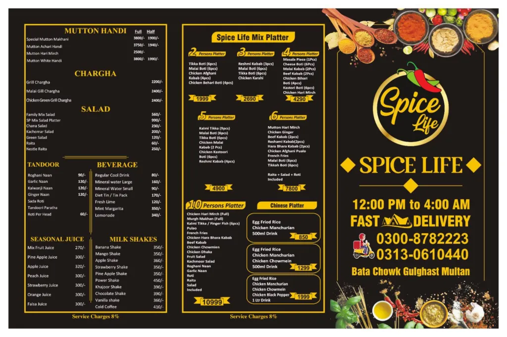 Spice Life Restaurant in Gulgasht Multan offers a wide-ranging menu that includes appetizers, soups, Chinese rice and gravy, chowmein, BBQ items, Chicken, Mutton & Beef Karahi, Handi dishes, Chargha, salads, tandoor items, seasonal juices, milkshakes, and family platters. With late-night service till 4 AM, it is suitable for family dinners, group gatherings, and special occasions. The extensive variety ensures options for both desi and Chinese food lovers under one roof.