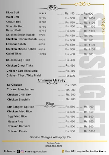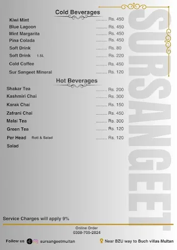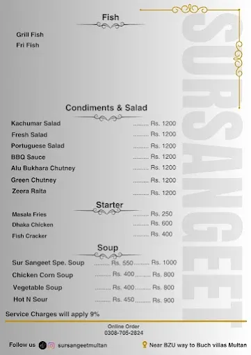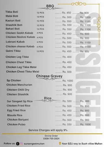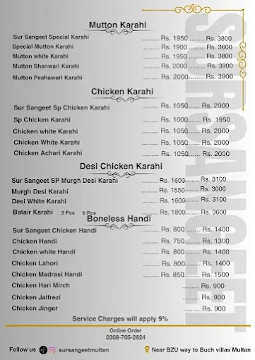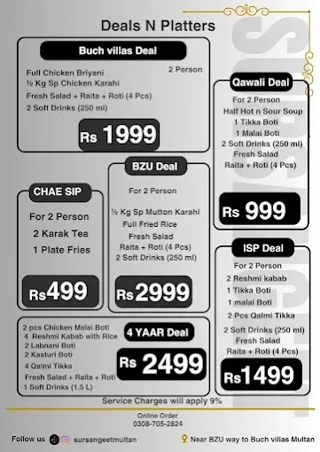 Sur Sangeet Qawwali Restaurant offers a complete menu of traditional Pakistani favorites, including specialty karahi, handi, BBQ, Chinese gravies, rice dishes, and beverages. Its variety of platters and deals caters to groups and families, while the 24/7 service ensures convenience for all dining occasions. With a mix of authentic flavors and signature dishes, it is a must-visit for anyone in Multan looking for hearty meals, qawwali ambiance, and excellent Pakistani cuisine.