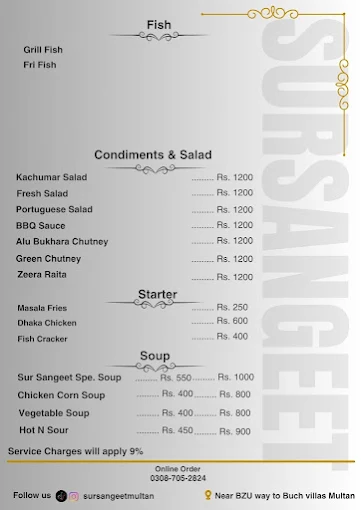 Sur Sangeet Qawwali Restaurant in Multan is a renowned dining spot offering traditional and specialty Pakistani dishes, including karahi, handi, BBQ items, Chinese gravies, biryani, pulao, and refreshing beverages. Located conveniently at Bzu Chowk Way, Buch Villas, the restaurant provides a full menu for individuals, families, and groups with deals and platters perfect for sharing. Open 24/7, it is ideal for casual meals, late-night dining, and special gatherings.