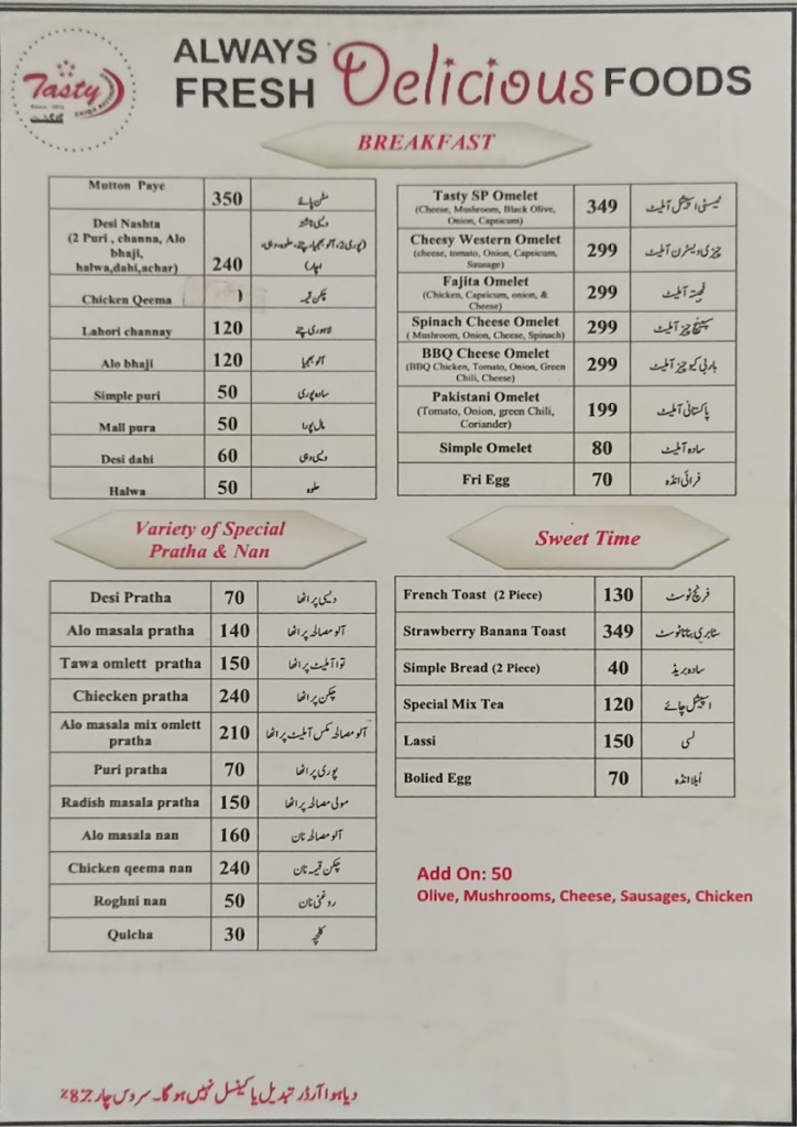 Tasty Student Zaiqa Multan is a complete food destination offering everything from breakfast to BBQ, biryani to mandi, Chinese to Turkish items β all at student-friendly prices. With long hours, multiple services, and a massive menu, itβs an excellent choice for families, gatherings, and late-night cravings in Gulgasht, Multan.